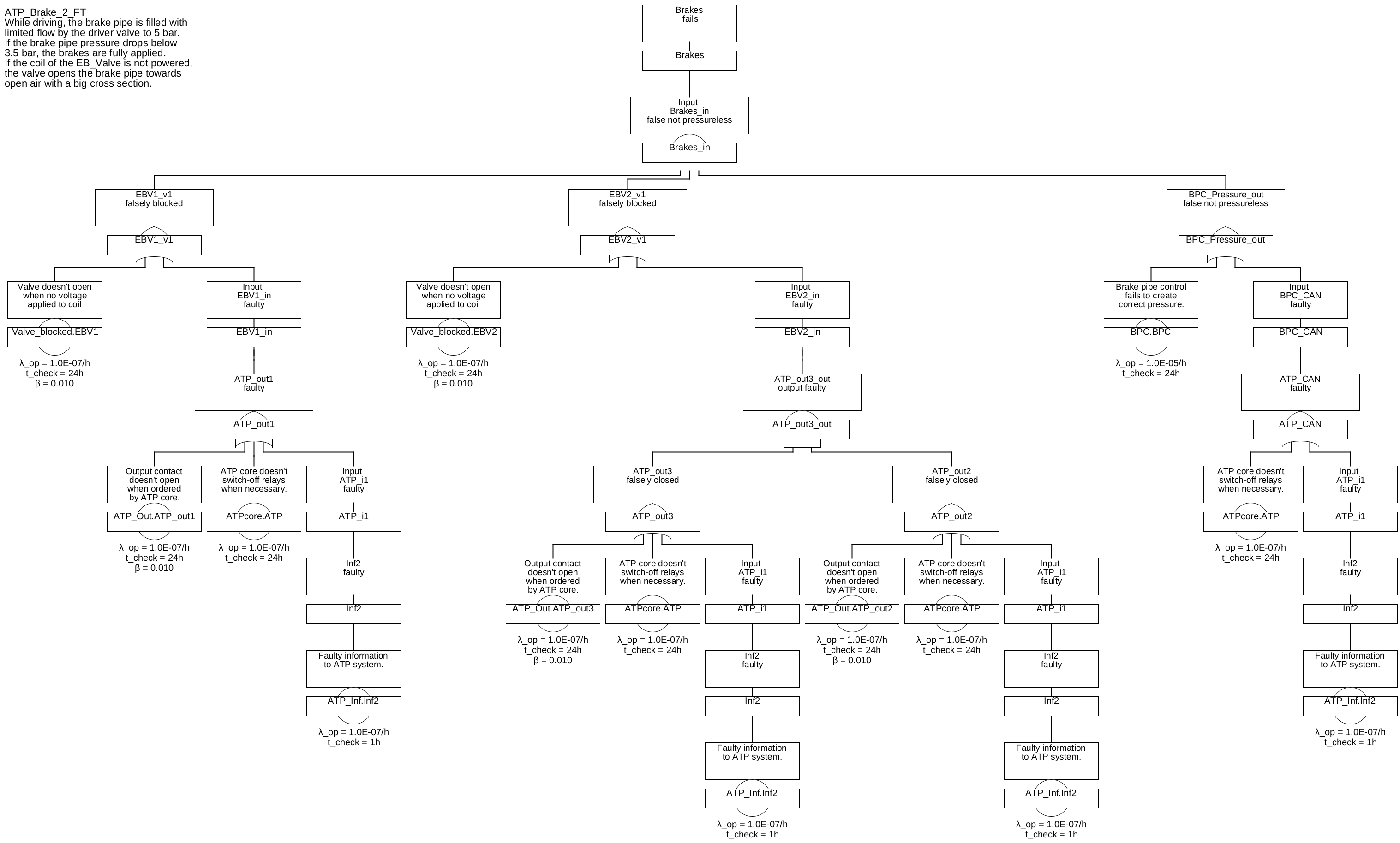 The safe low actor ‘brakes’ only fails (to create brake effort), if there is neither a connection to any of the strong low sources ‘Open Air’ by fault AND the ‘BPC’ provides high pressure by fault. The resulting fault tree is shown in figure 28.