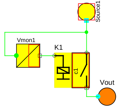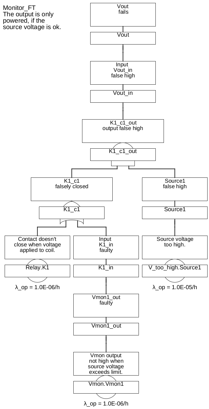 In the architecture shown in figure 24, the safe state safe low or open is used, in combination with a weak low source, telling the conversion algorithm that a loss of the output voltage ‘Vout’ doesn’t matter, but only a (too) high ‘Vout’. The source ‘Source1’ is usually ‘low’, i. e. correct in the view of the algorithm. Only if the ‘Source1’ is faulty (provides too high voltage) AND the contact ‘c1’ of relay ‘K1’ doesn’t open, the output voltage ‘Vout’ will fail (be too high). The resulting fault tree is shown in figure 26.