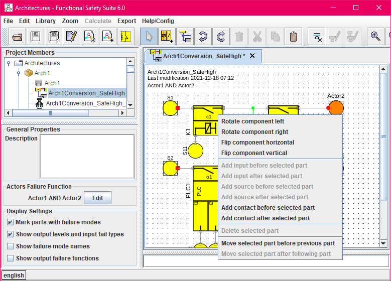 The architectures module of Functional Safety Suite aims to provide a functional block diagram language that is able to describe safety architectures in all fields of engineering. In a first step, you can use the module to draw functional block diagrams, requiring significantly less effort than using generic drawing tools. In a second step, an architecture can be automatically converted to a fault tree, given that some principles are respected and some additional information is provided.