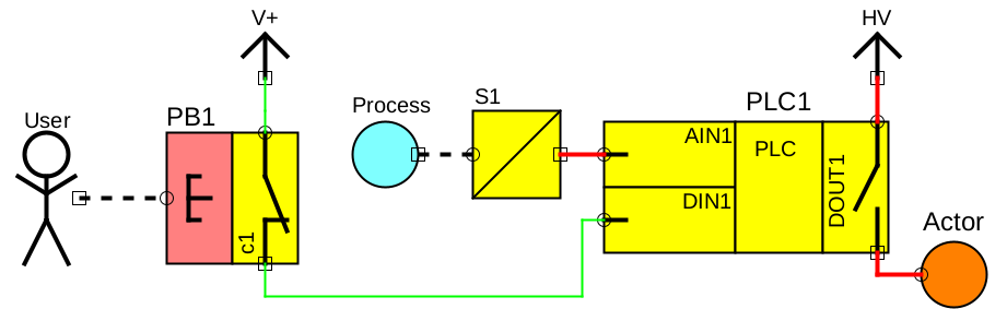 Let’s go back to the architecture shown in figure 19. There are three architecture components of class SOURCE: ‘User’, ‘V+’ and Process’. The component ‘Push-Button’ is of class RELAY, using a part of type SINK (the button) and a part of type CONTACT (the contact named ‘c1’). The component ‘Sensor’ is of class LINE, using a part of type SINK (including the left hand pin and some elements of the graphics) and a part of type SOURCE (including the right pin and some other elements of the graphics). The component ‘control’ is of class CONTROL, using two parts of type SINK (‘AIN1’ and ‘D_IN1’), a part of type LOGIC (‘PLC’) and a part of type CONTACT (‘DOUT1’). The component ‘Actor’ is of class ACTOR and uses one part of type SINK.