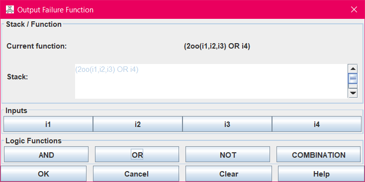 In functional safety, an ‘M-out-of-N’ operation is needed frequently (the so-called COMBINATION gate). This is no boolean operator, but a combination of boolean operations in fact, with unknown number of operands. In the failure functions dialog, a COMBINATION gate is entered by pressing COMBINATION after the second operand and each additional operand. When you press COMBINATION after the second operand, you’ll be asked to enter the minimum number of critical failures M for this combination.