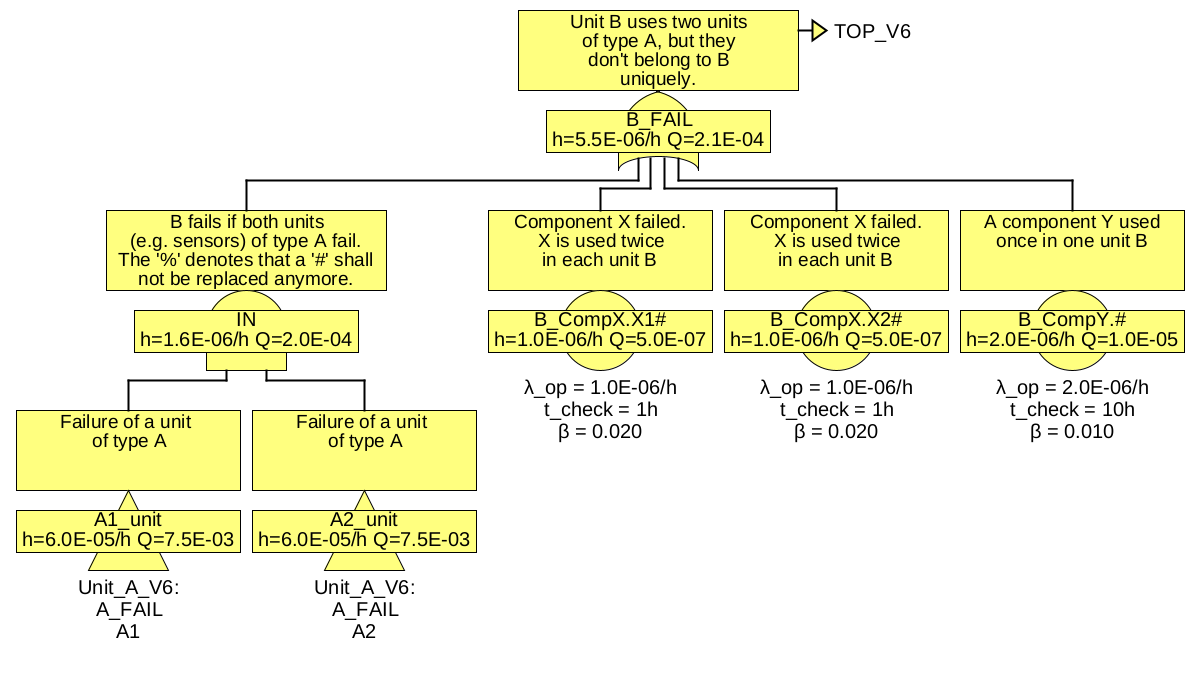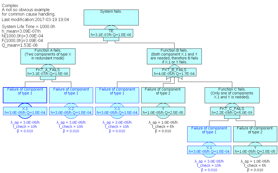 See figure 43 for an example. Given two components X.1 and X.2 of same type X. A common cause factor β of 1% is assumed between components of this type due to their construction, manufacturing and environment. For one function ‘A’ at least one of the two components X.1 and X.2 is needed, in another function ‘B’ component X.1 and another component Y is needed.