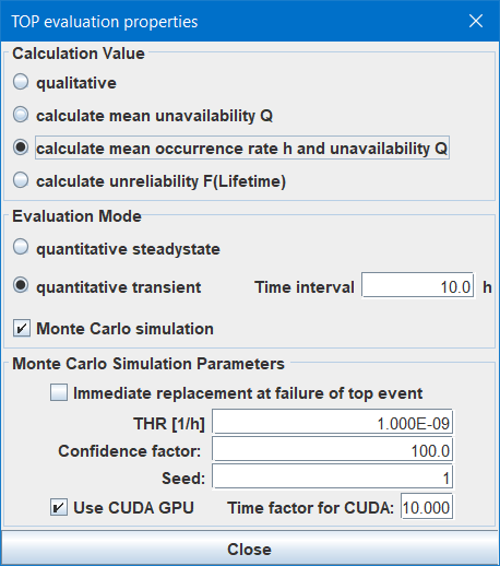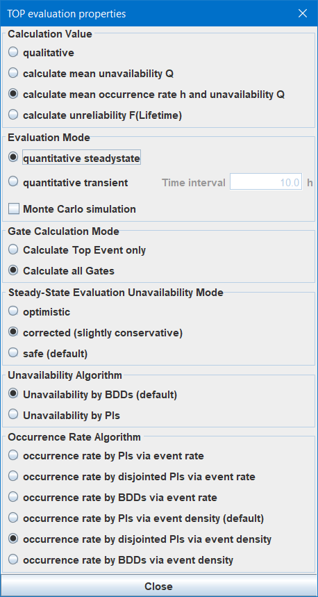 In case of direct calculation of the unreliability, you can select whether it shall be calculated By BDDs or By Prime Implicants (minimal cut-sets). In fact there is no reason for using prime implicants — it is much slower than via BDDs and the result is pessimistic (by BDDs the result is exact).