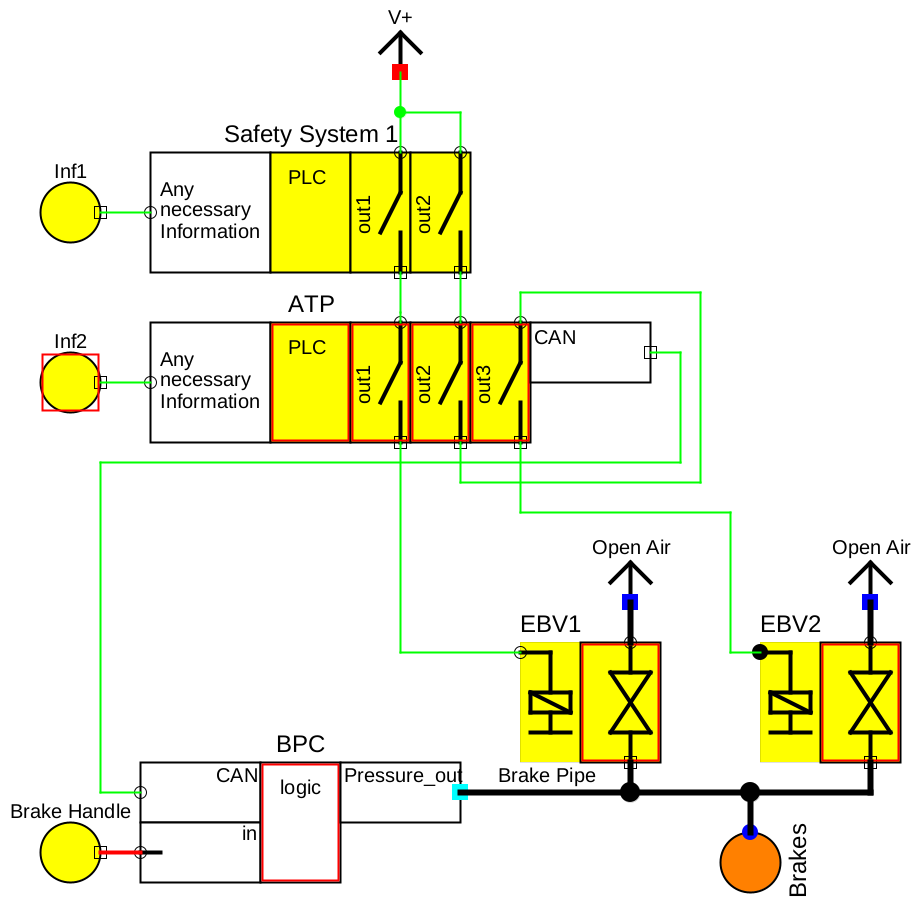 Standard railway brakes are applied, if the brake pipe pressure is below 3.5 bar. If the brake pipe pressure is 5.0 bar, the brakes are released. Between 3.5 bar and 5.0 bar, the brakes are partially applied. The brake pipe pressure is controlled by some electro-pneumatic equipment, here shown as a brake pipe control unit ‘BPC’, based on the position of the ‘Brake Handle’ and information from other systems, e. g. automatic speed controls or safety systems. The automatic train protection system ‘ATP’ shown in figure 27 commands an emergency brake by cutting the voltage of the coil of two emergency brake valves ‘EBV1’ and ‘EBV2’, which in turn open a wide section towards the open air each, so that the brake pipe pressure will drop to some very low value, even if the weak low source ‘Pressure_out’ of the brake pipe control unit ‘BPC’ provides a high pressure (>3.5 bar). In addition to this hard-wired cut-off, it is assumed that the ATP provides the brake command via CAN bus to the ‘BPC’ in addition, and that the ‘BPC’ creates a brake pipe pressure according to the most restrictive input information (in absence of faults).