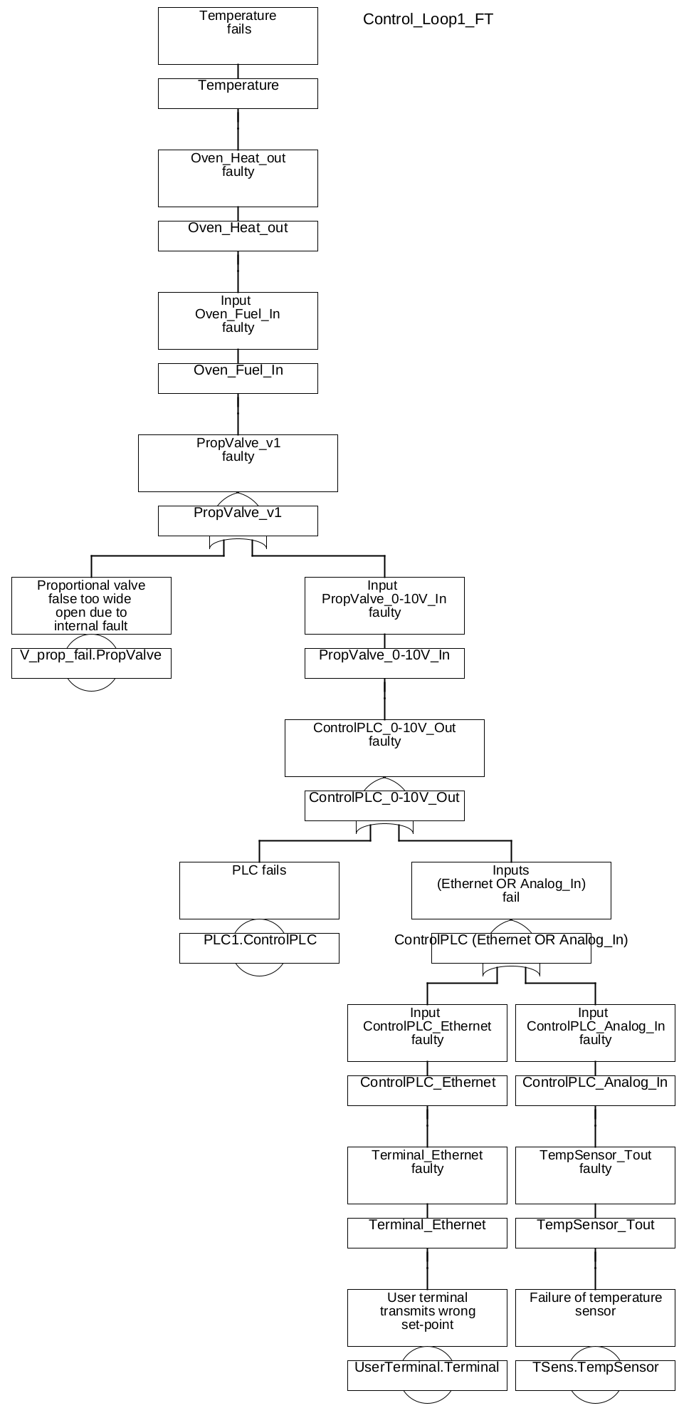 If you click Edit – Convert to Fault Tree, Functional Safety Suite will try to create a fault tree representing the failure characteristic of this architecture. The algorithm will parse the architecture starting with the actor(s). Here, we have only one component part of class ACTOR, the ‘Temperature’. The ‘Temperature’ fails, if the oven doesn’t work as expected. As long as the oven gets the correct amount of fuel, it is assumed to behave as expected (no failure mode assumed). Thus, the ‘Temperature’ can only fail, if the fuel flow to the oven doesn’t fit. The fuel flow is determined by the proportional valve – if the valve doesn’t close correctly, the fuel flow will be too high and the temperature will fail (become too high). The valve fails, if it is either defect, OR if it gets a wrong voltage by the control PLC. The PLC output fails, if either the PLC itself is defect, OR if a wrong set-point is sent by the terminal, OR if the temperature value used by the control algorithm is not correct (see section 6.6.2 for how to tell the algorithm which gate(s) to create for an output of a CONTROL). The temperature value is not correct, if the temperature sensor is defect.