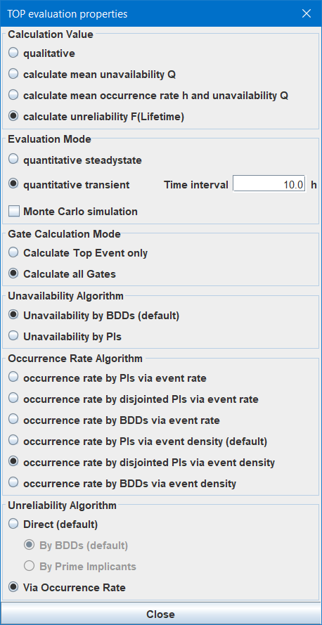 In case of direct calculation of the unreliability, you can select whether it shall be calculated By BDDs or By Prime Implicants (minimal cut-sets). In fact there is no reason for using prime implicants — it is much slower than via BDDs and the result is pessimistic (by BDDs the result is exact).