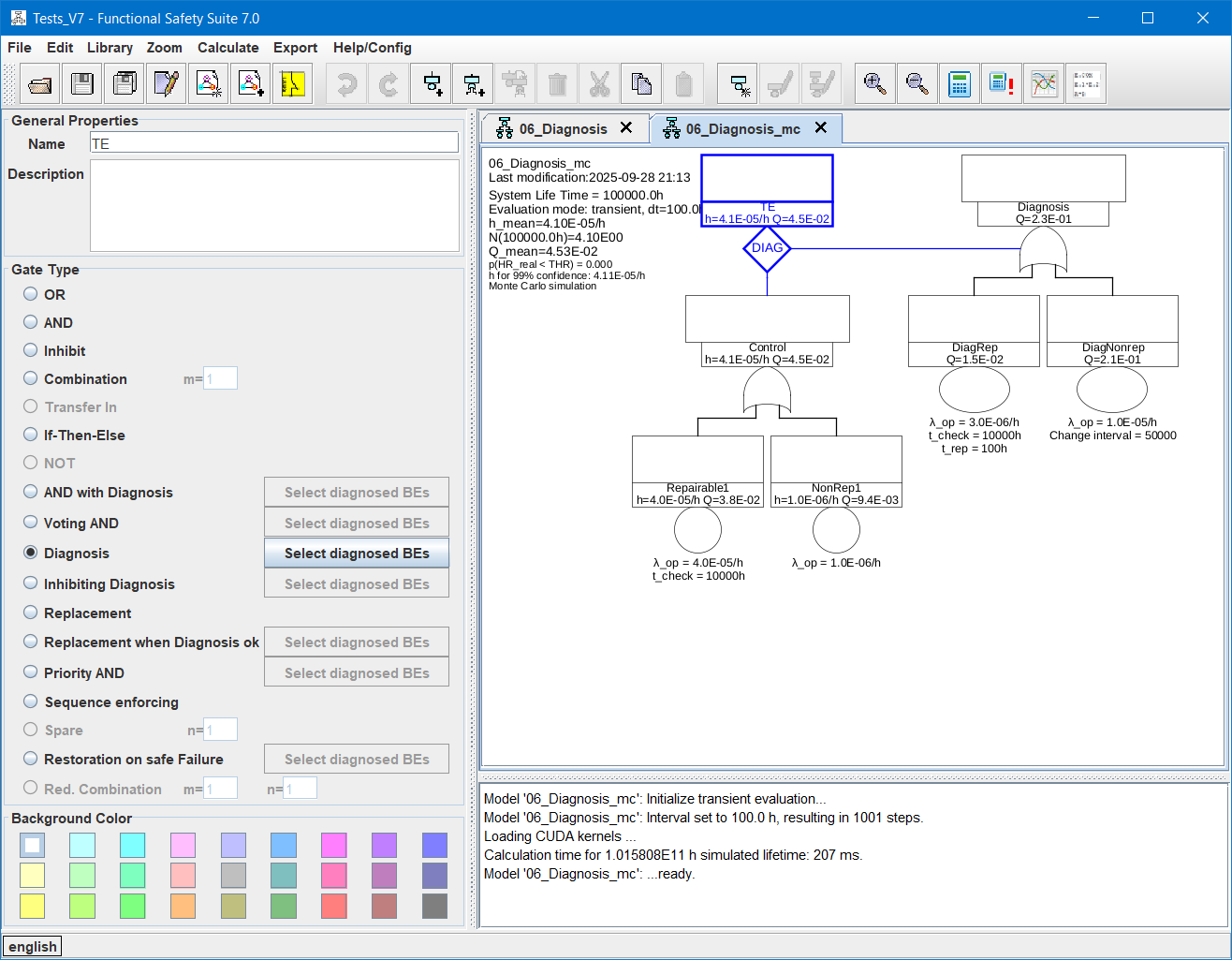 In Functional Safety Suite it is even more: From version 7.0 on, fault trees can be simulated by Monte-Carlo-Simulation as an alternative to the “classic” evaluation via prime implicants (minimal cut-sets). Monte-Carlo-simulation permits a much more detailed and thus more realistic modeling and evaluation. In particular, gates and basic events have a state that changes over time both randomly and according to predetermined rules: