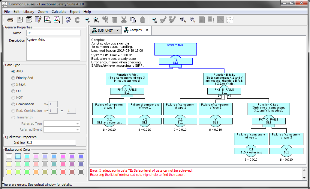 Since there is no mathematical rule how to “calculate” the SL of a gate based on the SL’s of the input gates or basic events, this task has to be performed manually. Therefore when evaluation type ‘qualitative’ is selected, the second line can be filled with an arbitrary text — as for example the assigned SL.