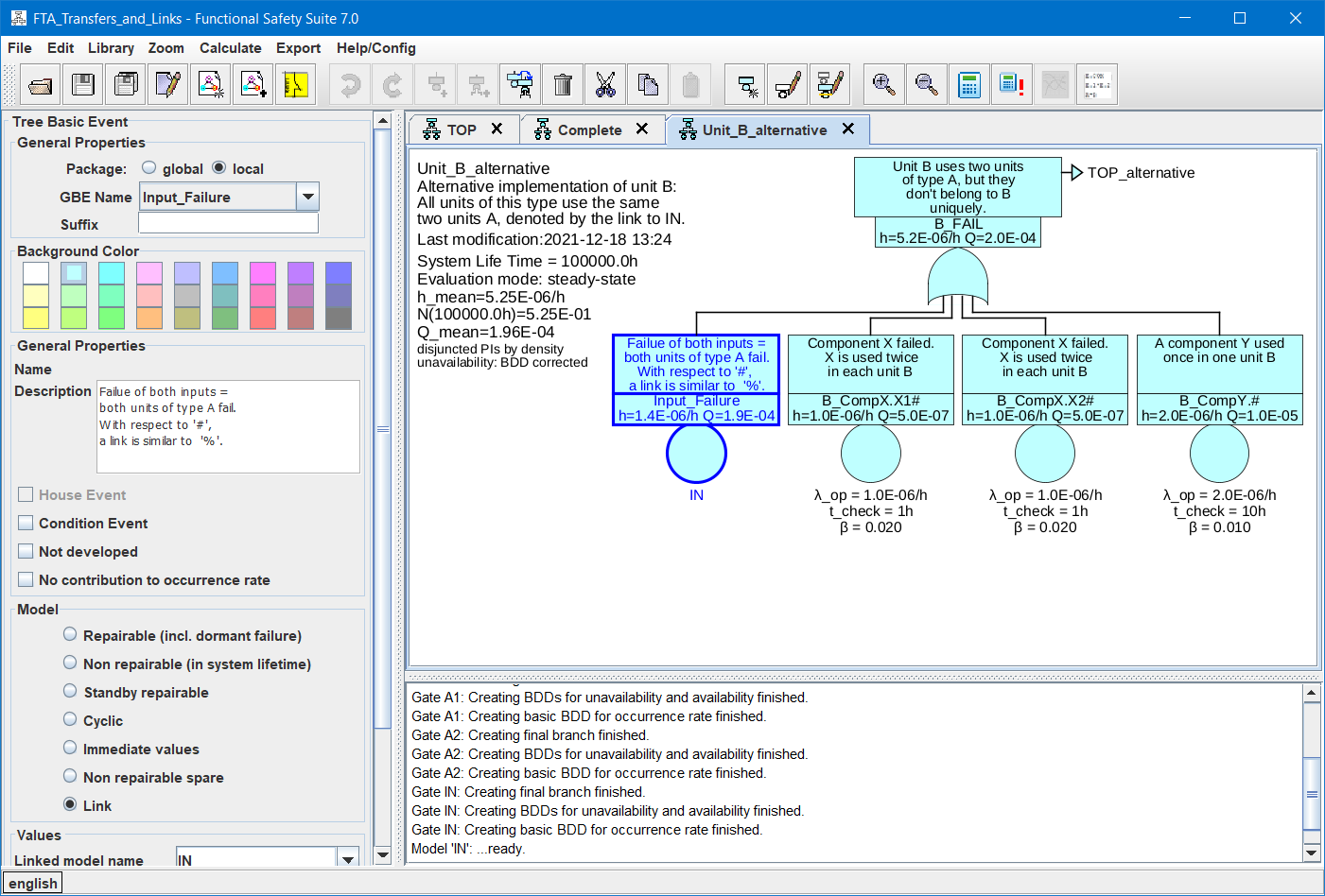 occurrence rate for repairable elements w (unit 1/h), the (unconditional) failure density F (unit 1/h), the unavailability Q, and the unreliability F can be calculated for each basic event. The occurrence rates h or w and the unavailabilities Q of the basic events are needed to calculate both occurrence rates and unavailabilities of higher level gates. The mean unavailability of the top event is the PFD, its mean occurrence rate