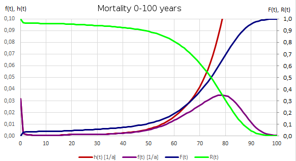 The cross-sectional analysis is based on the statistics of deaths during the period in question. It thus makes a statement in particular about the actual mean age at death of the people who died in this period. The mortality rate \(h(t)\) thus