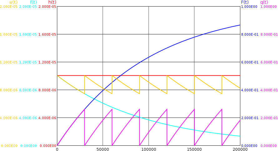 Due to the tests and repair, if necessary, the density function \(f(t)\) loses its meaning. It is replaced by a new quantity, usually called "failure frequency". In [NUREG] the formula sign \(w(t)\) is used for it, however, no harmonized formula symbol has yet been established for this quantity. In Figure 10 all three quantities \(h(t)\), \(w(t)\) and \(f(t)\) are shown for a function with constant failure rate \(h(t)=\lambda =\SI {1e-5}{\per \hour }\), which is tested every 30000 hours, are shown.