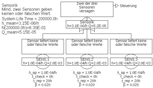 Tabelle 5: Minimalschnitte für Beispiel 6.6Minimalschnitt Eintrittsrate \(\overline {h}\) SENS.COM 2,0E-06/h AKT 1,0E-06/h SENS.1 & SENS.2 3,842E-07/h SENS.1 & SENS.3 3,842E-07/h SENS.2 & SENS.3 3,842E-07/h AUSWAHL 1,0E-07/h STRG.1 & STRG.2 4,0E-09/h STRG.1 & STRG.3 4,0E-09/h STRG.2 & STRG.3 4,0E-09/h Die Gesamt-Ausfallrate ist im Vergleich zum Beispiel 6.1 von 1,11E-4/h auf 4,26E-6/h gesunken, und wird nun hauptsächlich durch die Ausfälle der Sensoren aufgrund gemeinsamer Ursache (\(\beta \) wurde mit 2% angenommen) bestimmt.