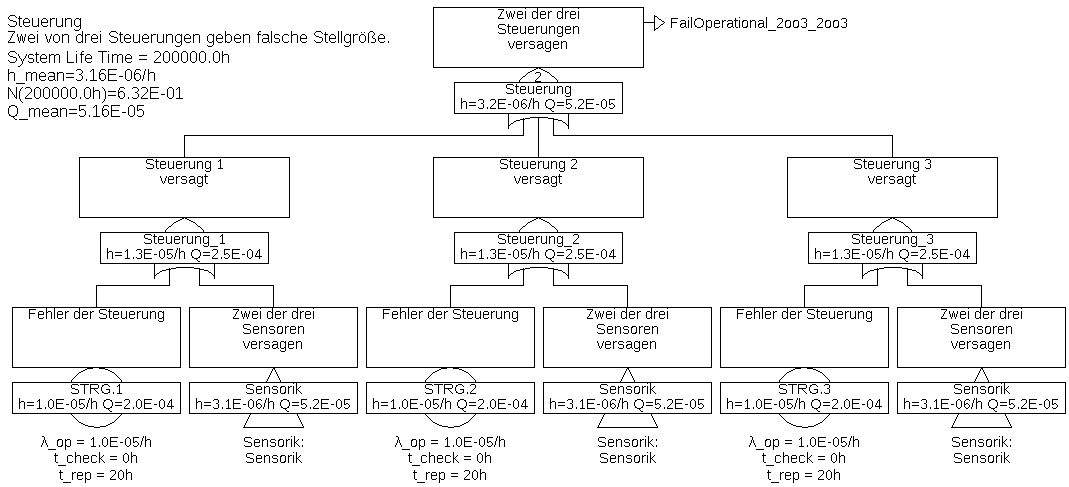 Die Ausfallrate der Sensorik (Gatter „Sensorik falsch“) ändert sich damit von \(\SI {2.2e-5}{\per \hour }\) auf \(\SI {2.0e-7}{\per \hour }\). Die Sensorik hat in diesem Fall also keinen großen Anteil an der Gesamt-Ausfallrate mehr.