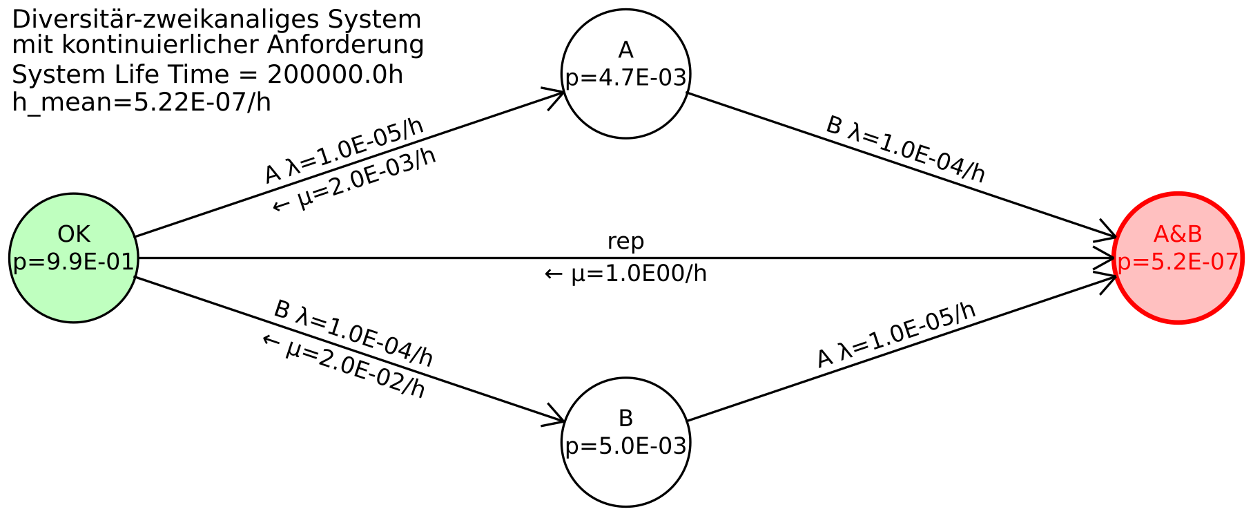 Wenn beide Kanäle versagen, versagt die kontinuierlich benötigte Sicherheitsfunktion, beendet also ihren Betrieb durch einen Unfall. Die Reparatur oder das Ersetzen des Systems nach einem Unfall führt zurück in den Ursprungszustand OK. Die Aufenthaltswahrscheinlichkeit im Zustand A&B während des Betriebs ist null, was durch ein im Vergleich zu den Ausfallraten sehr großes \(\mu _\mathrm {rep}\) modelliert wird.