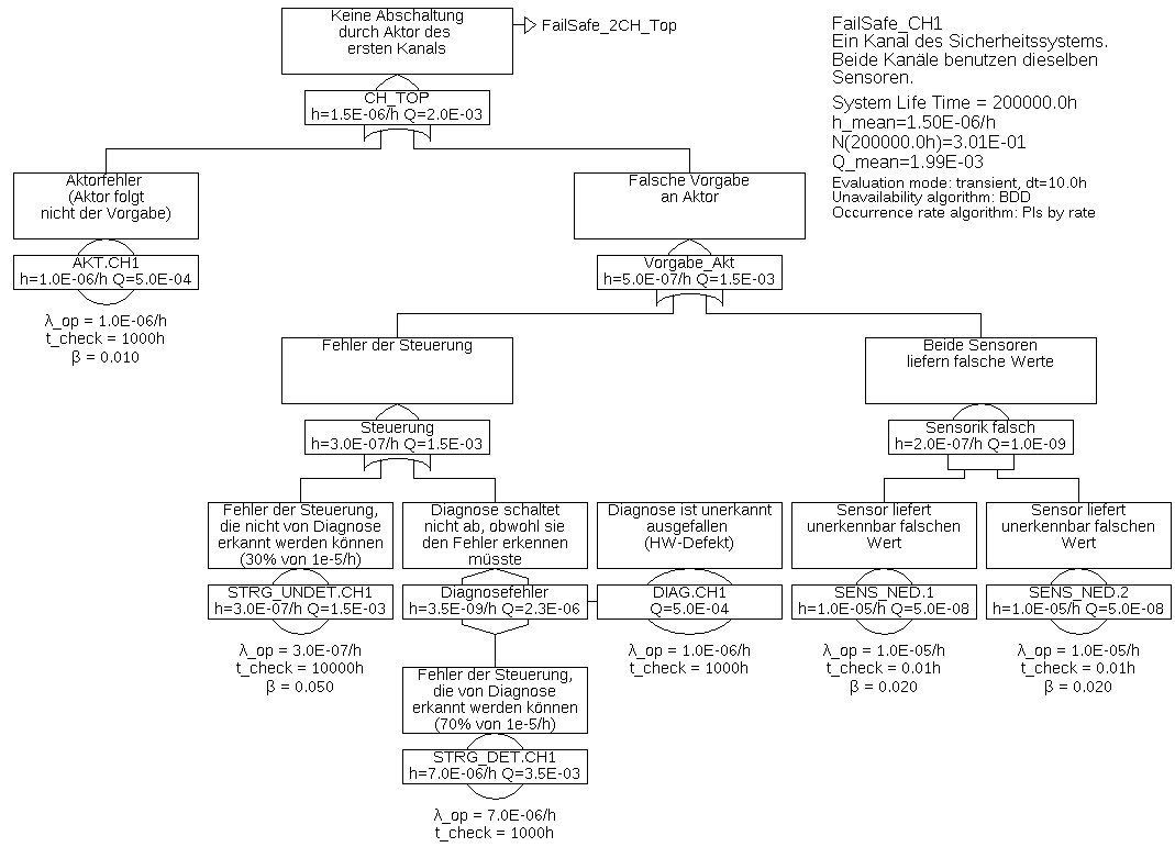 Tabelle 4: Minimalschnitte für Beispiel 6.5Minimalschnitt Eintrittsrate \(\overline {h}\) SENS_NED.COM 2,0E-07/h STRG_UNDET.COM 1,5E-08/h AKT.COM 1,0E-08/h AKT.CH1 & STRG_UNDET.CH2 1,548E-09/h AKT.CH2 & STRG_UNDET.CH1 1,548E-09/h AKT.CH1 & AKT.CH2 9,699E-10/h STRG_UNDET.CH1 & STRG_UNDET.CH2 8,106E-10/h STRG_DET.CH2 & STRG_UNDET.CH1 & DIAG.CH2 5,745E-12/h STRG_DET.CH1 & STRG_UNDET.CH2 & DIAG.CH1 5,745E-12/h AKT.CH1 & STRG_DET.CH2 & DIAG.CH2 4,542E-12/h AKT.CH2 & STRG_DET.CH1 & DIAG.CH1 4,542E-12/h SENS_NED.1 & SENS_NED.2 9,604E-13/h STRG_DET.CH1 & DIAG.CH1 & STRG_DET.CH2 & DIAG.CH2 2,393E-14/h Aus Tabelle 4 geht deutlich hervor, dass die Ausfälle aufgrund gemeinsamer Ursache die wesentlichen Ereignisse sind. Das ist nicht nur in diesem Beispiel so, sondern entspricht der praktischen Erfahrung. Aus diesem Grund muss bei mehrkanaligen Systemen immer eine Common-Cause-Analyse durchgeführt werde, und eine Vielzahl von Maßnahmen ergriffen werden, um die Rate von Ausfällen aufgrund gemeinsamer Ursache (mathematisch beschrieben durch den \(\beta \)-Faktor) möglichst klein zu halten.