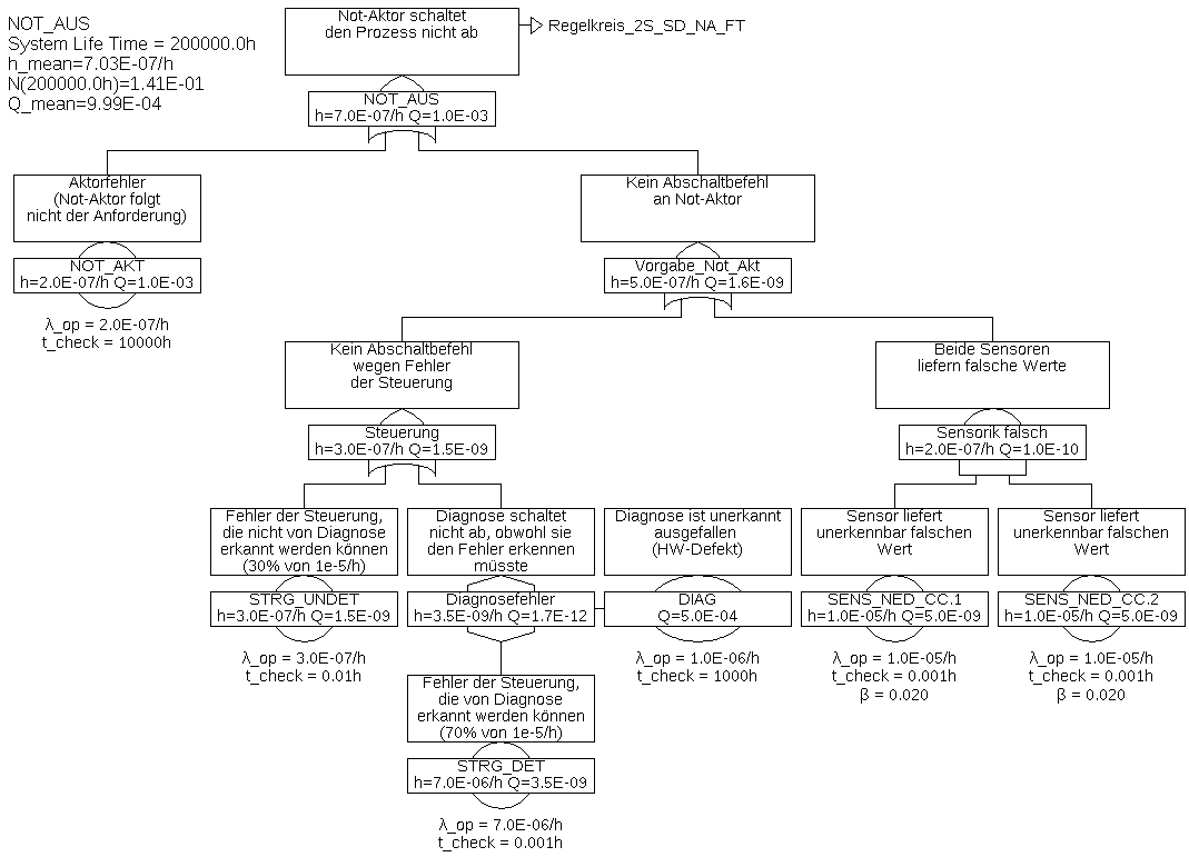 Der Fehlerbaum wurde aus Platzgründen in zwei Teil-Fehlerbäume aufgeteilt. Der Teil-Baum für das Gatter „Notaktor_aus“ wurde mittels eines Transfer-Gatters mit dem übergeordneten Fehlerbaum verbunden. Das Transfer-Gatter selbst hat keinerlei Auswirkung auf die Berechnung, es ist nur ein Verweis auf einen Zweig an anderer Stelle.