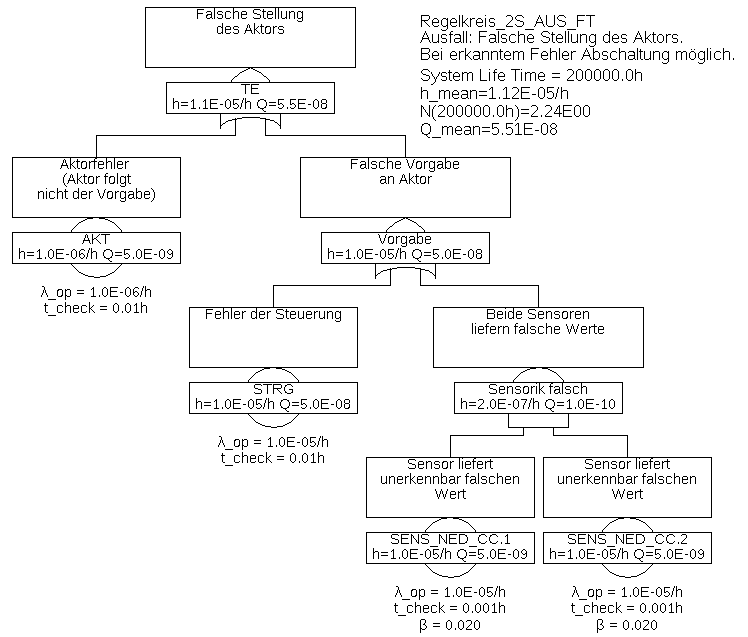 1. Man verringert die Ausfallrate der diagnostizierten Komponente (hier STRG) entsprechend des Diagnose-Deckungsgrads. Die Diagnose taucht also im Fehlerbaum nicht explizit auf. Der Vorteil ist offensichtlich ein einfacher Fehlerbaum. Nachteil ist, dass die Diagnose nicht ausdrücklich als sicherheitsrelevante Komponente erwähnt wird, man also stillschweigend voraussetzt, dass die Diagnose immer funktionieren wird. Tatsächlich aber unterliegt auch die Diagnose und insbesondere der Abschaltpfad zufälligen Ausfällen und muss daher in den meisten Anwendungen regelmäßig getestet werden.