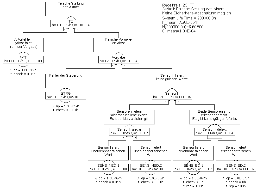 Beispiel 6.5 Der Fehlerbaum eines zweikanaligen Steuerungssystems, bestehend aus der von den vorherigen Beispielen schon bekannten Sensorik, welche gemeinsam von zwei Steuerungen mit jeweils eigener Diagnose und eigenem Aktor verwendet wird, ist in Abbildung 29 mit dem unterlagerten Baum gemäß Abbildung 30 dargestellt. Da die Kanäle gleich aufgebaut sind, ist nur der Teil-Fehlerbaum des ersten Kanals dargestellt.