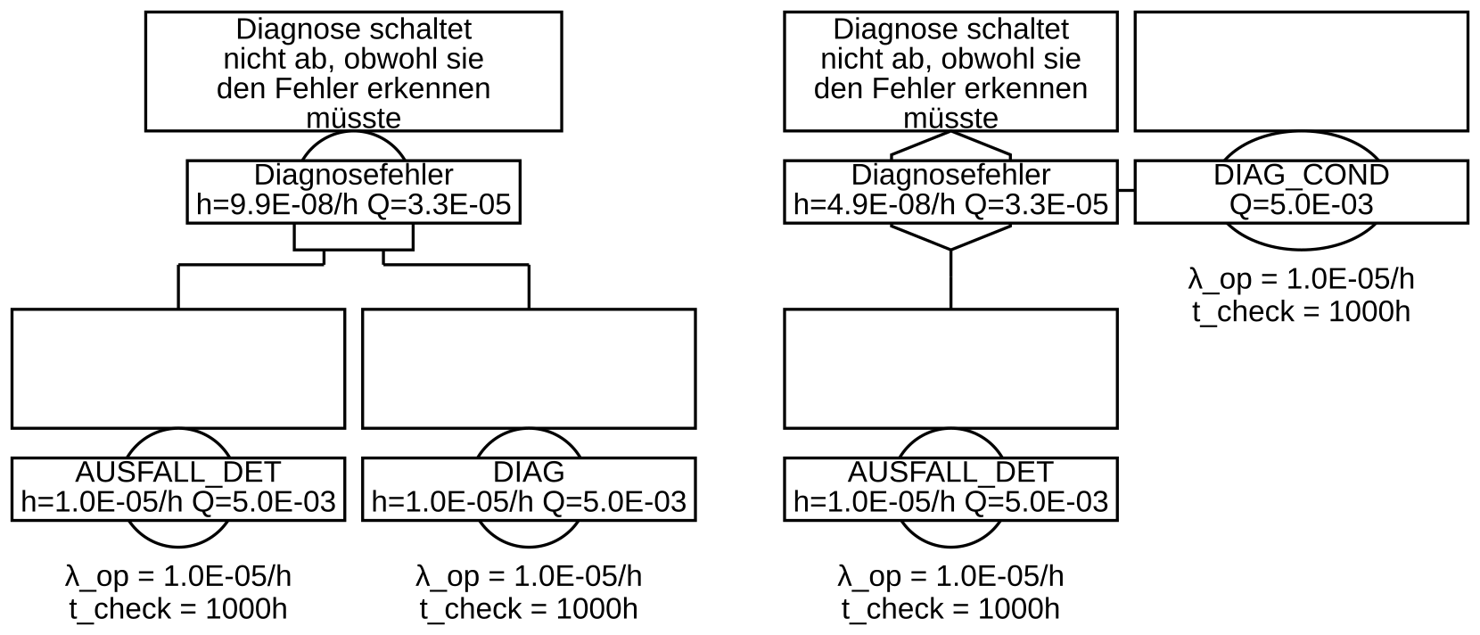 Der Ausfall der Diagnose selbst wird ebenfalls als Basisereignis (DIAG) mit einer bestimmten Ausfallrate und Testintervall modelliert. Das Ereignis für die erkennbaren Ausfälle wird mit der Diagnose mittels UND-Gatter verbunden, vgl. Abbildung 26 links.